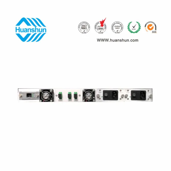 主波-5 ~ +10 d Bm輸入,插播按需求功率配置,合波放大標稱規格(18、19、20、21)輸出,并支持上調+0.5dB,下調-3dB,NF ≤ 5dB(0dBm時);1U標準機箱,雙模塊熱插撥電源,AC90 ~ 255V或DC-48V供電,RJ45標準網管(支持SNMP、WEB)